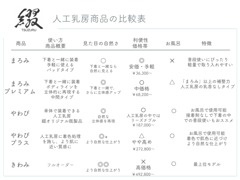 ※人工乳房・パッドの種類別の違いについては、下記比較表をご覧ください